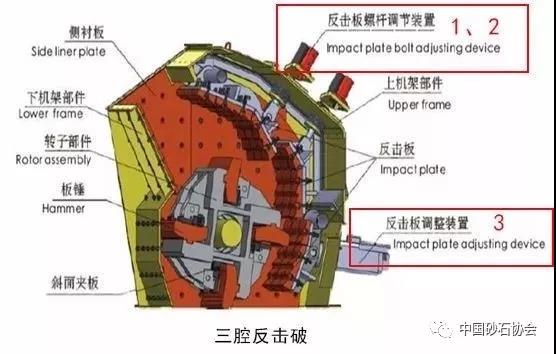 調整反擊架與轉子架之間的間隙可達到改變物料出料粒度和形狀的目的。、二反擊板通過頂部螺桿調節裝置,若存在第三塊反擊板(歐版反擊破),則通過墊片調節。