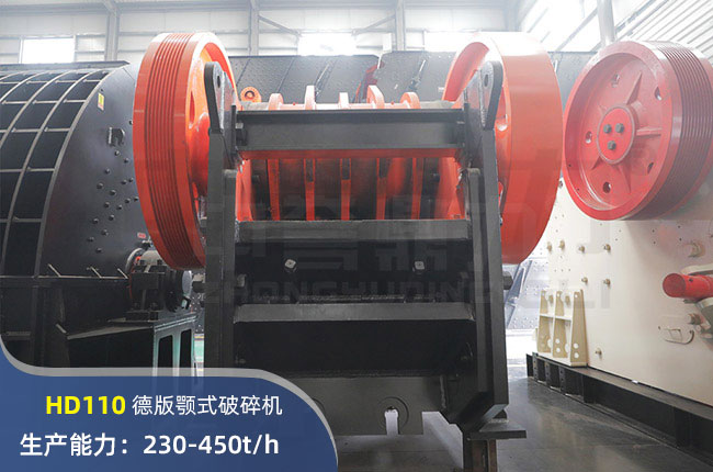 HD110(912)顎式破碎機(jī)進(jìn)料口尺寸850×1100mm,進(jìn)料粒度750mm,出料大小100-200mm,電機(jī)功率6p 132kw,時(shí)產(chǎn)可達(dá)450噸。