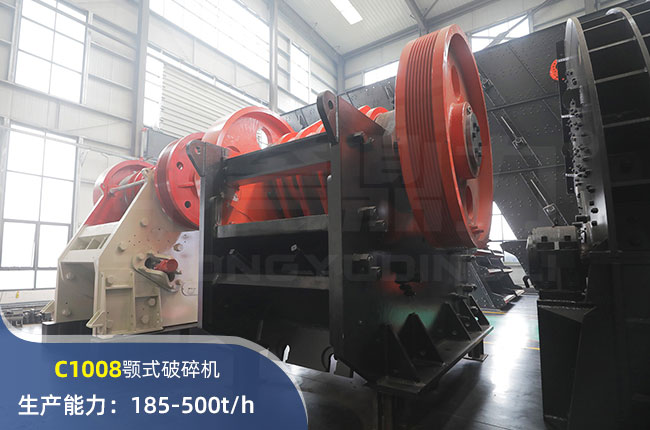C1008顎式破碎機時產(chǎn)量在185-500噸左右,電機配備的是110kw的,進料粒度800mm,出料粒度65mm,屬于中小型顎式破碎機。