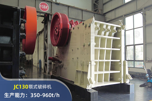 JC130顎式破碎機進料口尺寸1300×1000mm,進料粒度≤850mm,出料大小≤125mm,電機功率185kw,時產能力在350-960噸左右。
