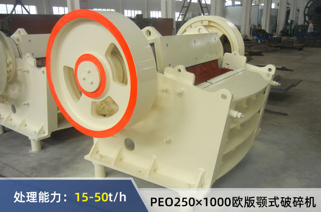 PEO250×1000歐版顎式破碎機進料口大小250×1000mm,進料≤220mm,出料20-40mm之間,時產量15-50噸,配置的電機功率是37kw,外型尺寸1400×1850×1310mm,重量是5.6噸。