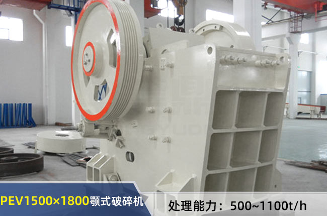 PEV1500×1800顎式破碎機進料粒度<1250mm,出料大小在210-360mm之間,時處理能力500-1100噸,電機功率是280千瓦,外形尺寸7460x6240x4250mm,重122噸。