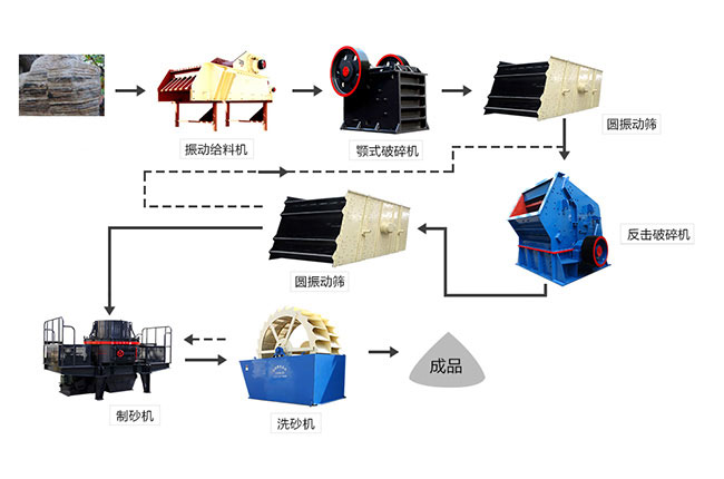 兩段加工流程主要有開路以及閉路兩大類,針對進口物料規格在200-400毫米,產品物料規格在12-30毫米的小產量井下選礦廠實用,在某些情景下段的破碎工作量不大,這時在破碎前能夠不進行預先篩,直接選用兩段閉路加工流程,兩段開路破碎的運用,主要常見于某些重選廠或需要將破碎后的物料直接送至磨機的小產量選礦廠。