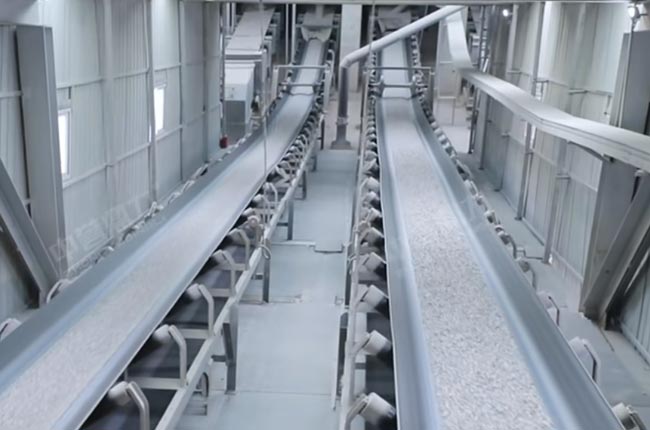皮帶機(jī)進(jìn)入罐倉(cāng)(5000噸/個(gè)),某種成品料滯銷(xiāo)時(shí),通過(guò)庫(kù)下皮帶機(jī),轉(zhuǎn)存到成品緩沖倉(cāng),成品緩沖倉(cāng)下面有一個(gè)通廊,也可以已實(shí)現(xiàn)自動(dòng)裝車(chē)。