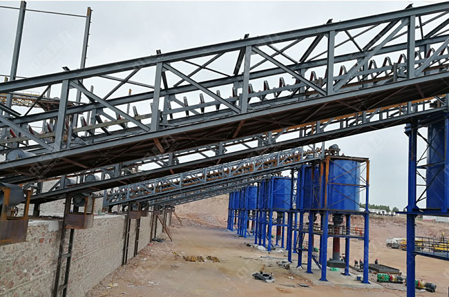 整個加工流程是:石灰石由除土篩預先除土篩分,得到清潔度較高的石灰石再由1820破碎機進行破碎,4臺并排安裝的3070振動篩進行篩選,再由1220整形錘破進行二次整形破碎,4臺并排安裝的3070振動篩進行篩選。