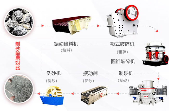 大型:喂料機+顎破機(初級破碎)+圓錐石子機(二破)+制砂機械+洗石機(選配)+篩機